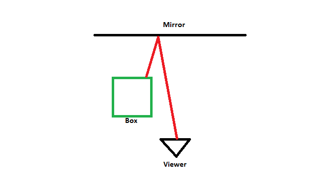 This effect also tends to have a lot of trouble with rays facing back towards the viewer. When given thought, it makes a lot of sense that this would present an issue. For one, if the ray reflects directly back at the viewer, it will never intersect the depth buffer, thus basically degenerating into the case of rays traveling off-screen that’s already been discussed. The other issue is similar, but maybe not as obvious. If a ray is traveling back in the general direction of the viewer and it does intersect the depth buffer, it’s likely to do so on a face of an object that’s faced away from the viewer. This means that even if an intersection is reported, an incorrect result will be sampled from the light buffer at that position. This can lead to ugly artifacts such as streaks across surfaces. The figure below shows a top-down view of a ray being cast from the viewer, hitting a mirrored surface, and finally making contact with the back of a box. Since from the viewer’s perspective the back of the box is not currently on-screen, erroneous results will be returned if that result is used.