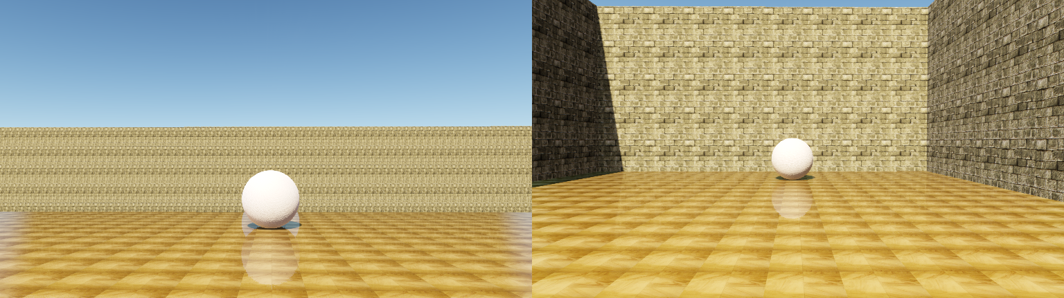 It’s mentioned earlier that a fallback technique is useful for any screen space reflection technique. This implementation uses parallax-corrected cube maps based on Lagarde’s post [4]. These also include a fallback to generic, non-corrected cube maps as a last resort. These values are all computed before the screen space reflections technique starts and are accessed above in the cone tracing step through the “indirectSpecularBuffer” resource. While fallback methods won’t be as exact as ray traced results, properly set-up cube maps can certainly help alleviate jarring artifacts. The image below shows a comparison of two sections of the same scene. The left half of the image does not have good cube map placement and the missed reflection data is quite noticeable under the sphere. The right half includes blended parallax-corrected cube maps and introduces a much less severe penalty for missed rays.
