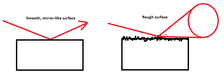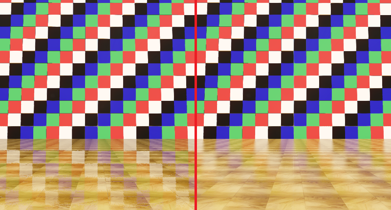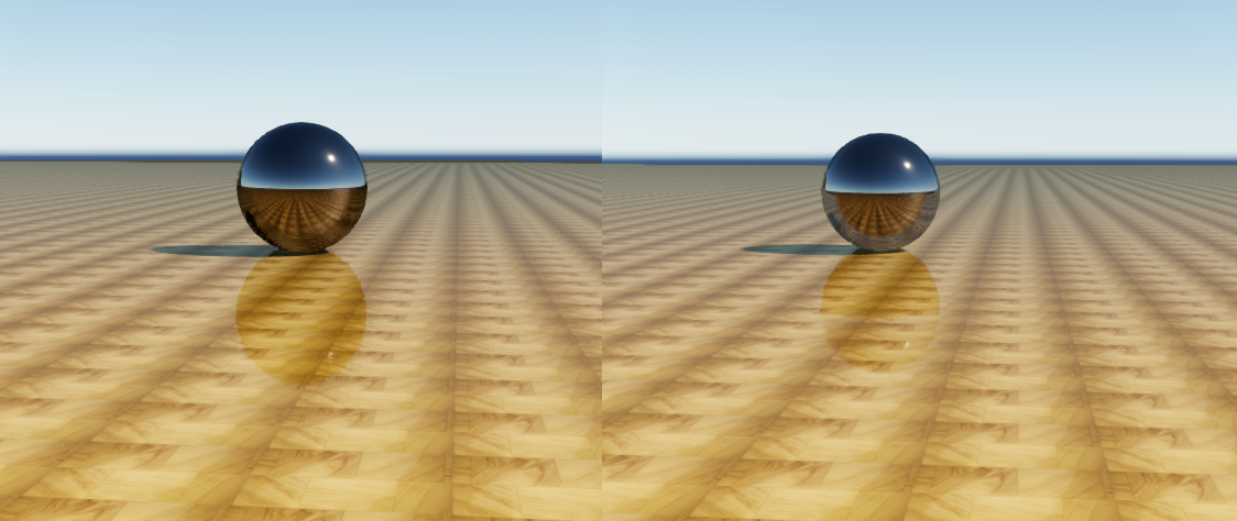 One further challenge with the generic approach described above is that if the result is used directly, only perfectly mirror-like reflections can be generated. In the real world, most surfaces do not reflect light perfectly, but instead scatter, absorb, and reflect it in varying proportions due to microfacets [9]. To account for this, the technique needs to not only consider where the ray intersects the depth buffer, but also the roughness of the reflecting surface and the distance the ray has traveled. The following image shows a comparison of mirror-like and glossy reflections. Notice on the right half of the image how the further the ray has to travel to make contact, the blurrier it becomes.